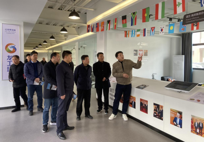 衢州市有關(guān)領(lǐng)導(dǎo)首先參觀了大龍網(wǎng)集團旗下的歙縣龍工場,歙縣大龍網(wǎng)區(qū)域負責(zé)人江笑平向到訪領(lǐng)導(dǎo)介紹了龍工場的基本情況、運營模式及優(yōu)勢背景;并對園區(qū)供應(yīng)鏈融資服務(wù)平臺、電商直播中心、運營中心、共享會議室、洽談區(qū)等多個模塊運營流程及整體情況進行了詳細講解。通過江總的介紹,衢州市領(lǐng)導(dǎo)對歙縣龍工場有了清楚的認知,并對大龍網(wǎng)運用數(shù)字貿(mào)易推動黃山眾多實體企業(yè)走出國門、走向世界的成功做法和發(fā)展前景表示贊賞。